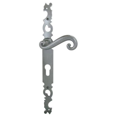 Cet ensemble sur plaque de style CEVENNES est conçu pour les portes d’entrée avec moulure, l’utilisation de béquilles longs col est nécessaire.