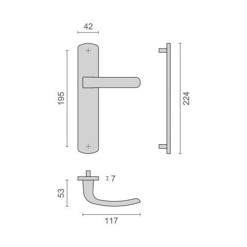 Tige carrée percée de 7mm et kit de fixation pour porte allant jusque 70mm d’épaisseur.